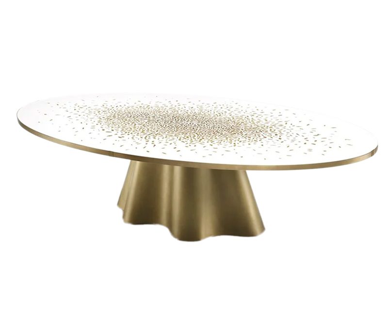 Both elements of this product are poetic: the top is made of white marble Venetian seminato, which houses and guards small “shattered” pieces of brass. The central leg is equally artistic and sculptural, taking sinuous and distinctive folds. Both in terms of the brass fragments and the movement of the leg, it seems that this table is placed in the middle of a wind tunnel, which makes it unique. An object of common use, but one that comes dangerously close to the world of artwork.